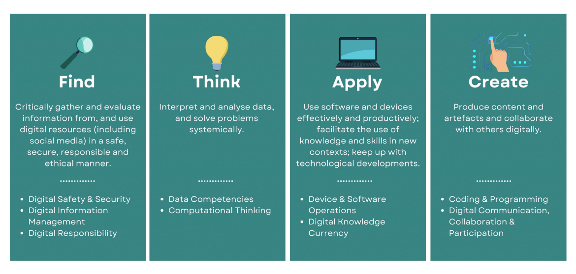 Our digital literacy programme is anchored on the Find–Think–Apply–Create (FTAC) framework, which provides a structured and progressive approach to developing students’ digital skills and dispositions.